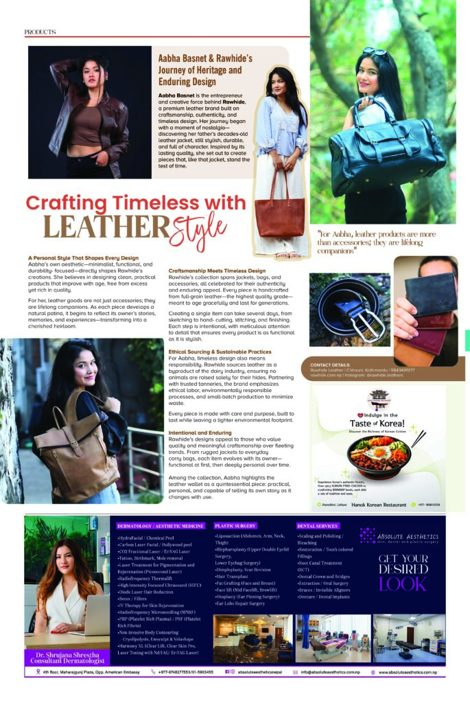 Aabha Basnet is the entrepreneur and creative force behind Rawhide, a premium leather brand built on craftsmanship, authenticity, and timeless design. Her journey began with a moment of nostalgia—discovering her father’s decades-old leather jacket, still stylish, durable, and full of character. Inspired by its lasting quality, she set out to create pieces that, like that jacket, stand the test of time.