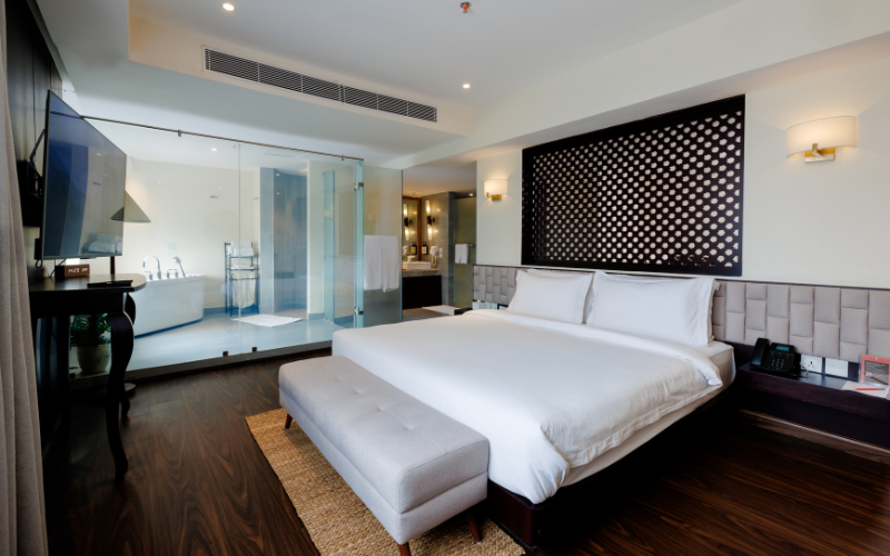 The Executive Suite redefines indulgence with its 50-square-meter layout, complete with a private jacuzzi, smart WC, automated controls, and a 55-inch smart TV. Electronic frostable glass ensures privacy, while a king-size mattress guarantees exceptional comfort. For extended stays or families, the Apartment Suite offers a spacious living area paired with a twin room, creating a home-like environment without compromising luxury.