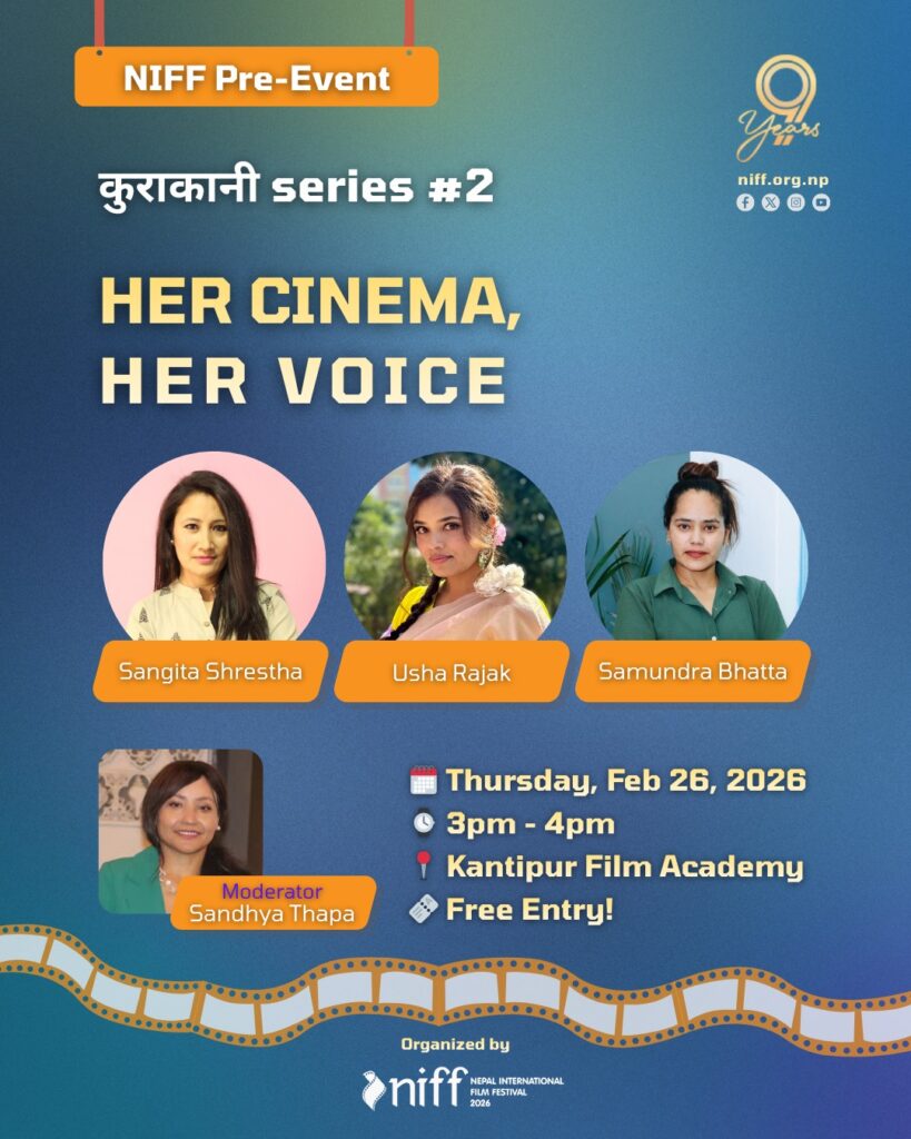 The Nepal International Film Festival (NIFF) is continuing its pre-event conversations with the second session of its Kurakani Series, titled “Her Cinema, Her Voice,” set to take place on February 26, 2026. The event will be held from 3 PM to 4 PM at the Kantipur Film Academy in Gairidhara, offering free entry to all film enthusiasts and aspiring creators.