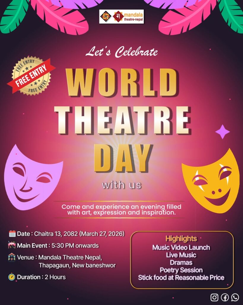 Kathmandu’s cultural scene comes alive today as theatre lovers gather to celebrate World Theatre Day with an immersive evening hosted by Mandala Theatre Nepal. Taking place in Thapagaun, New Baneshwor, the event promises a dynamic blend of performance, music, and artistic expression, all under one roof.