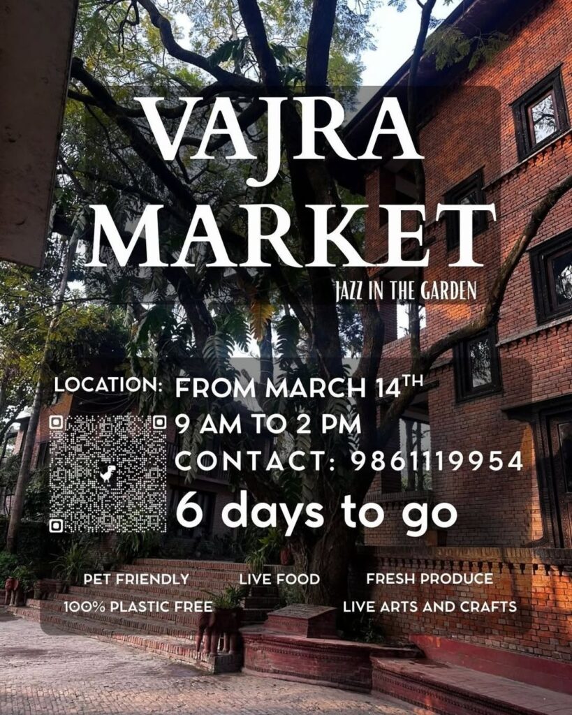 Vajra Market: Jazz in the Garden is set to bring a refreshing weekend experience starting March 14 from 9 AM to 2 PM. Hosted in a serene garden setting, the market promises a lively atmosphere with live jazz music, fresh produce, and a variety of food stalls. Visitors can explore unique arts and crafts while enjoying a relaxed community vibe. The event is pet-friendly and proudly promotes a 100% plastic-free environment, encouraging sustainable shopping and gatherings. With music, food, and creativity all in one place, Vajra Market is shaping up to be a charming morning destination in Kathmandu.