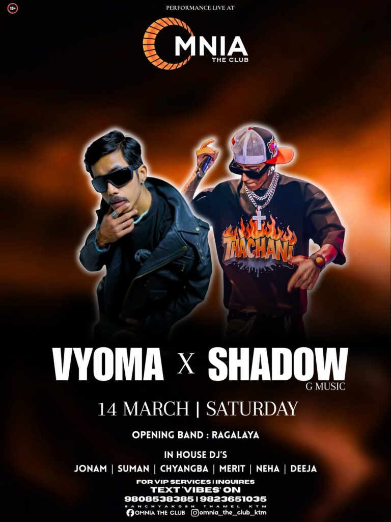For those looking to end the night on a more energetic note, the spotlight moves to Omnia The Club, where Vyoma x Shadow are set to perform live. The collaboration is expected to deliver an electrifying night of music, bringing together vibrant beats, live energy, and Kathmandu’s thriving nightlife community. As one of the city’s popular weekend destinations, Omnia is likely to draw a lively crowd ready to celebrate the weekend on the dance floor.