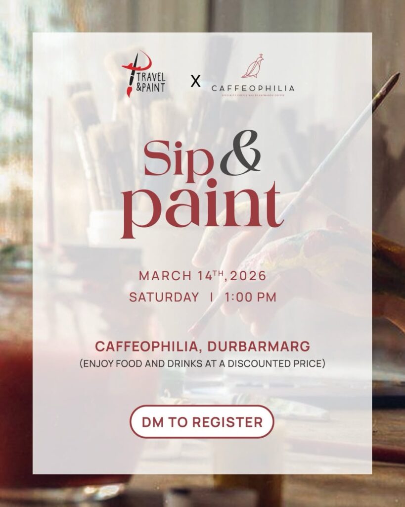 The afternoon begins with Sip and Paint at Caffeophilia, where creativity meets a relaxed cafe atmosphere. Organized by Travel & Paint, the session invites participants to unwind with a brush in one hand and coffee in the other. Starting at 1:00 PM, the event offers guests the opportunity to paint their own canvas while enjoying curated food and drink selections at special prices. Designed for both beginners and experienced artists, the gathering blends artistic exploration with the comforting rhythm of Kathmandu’s cafe culture.