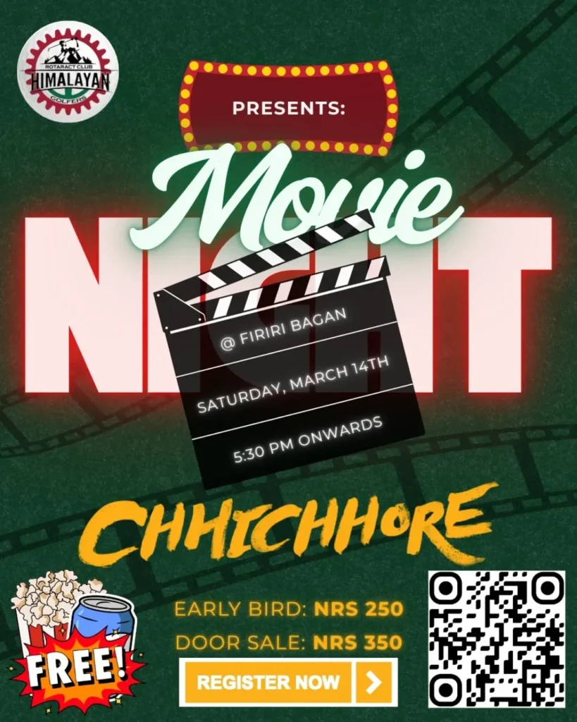 As evening approaches, the focus shifts to an outdoor cinematic experience at Firiri Bagan. The event features an open-air screening of the beloved Bollywood film Chhichhore. Beginning at 5:30 PM, the screening offers audiences the charm of watching a film beneath the evening sky, complete with complimentary popcorn and a cold drink. With early bird tickets priced at NPR 250 and door entry at NPR 350, the event promises a relaxed weekend gathering for movie enthusiasts and social crowds alike.