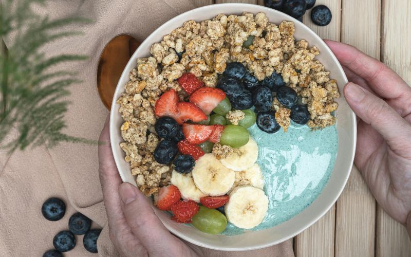 - Oatmeal made with fortified soy or almond milk, topped with fruits and seeds