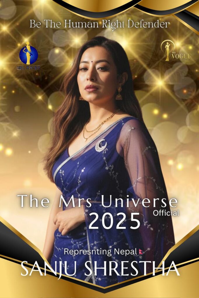 Nepal extends its warmest wishes to Sanju Shrestha, the 1st Runner-Up of Mrs. Vogue Nepal, as she represents Nepal on the global stage at Mrs. Universe Official 2025, taking place from October 8 to October 14 in Manila, Philippines.